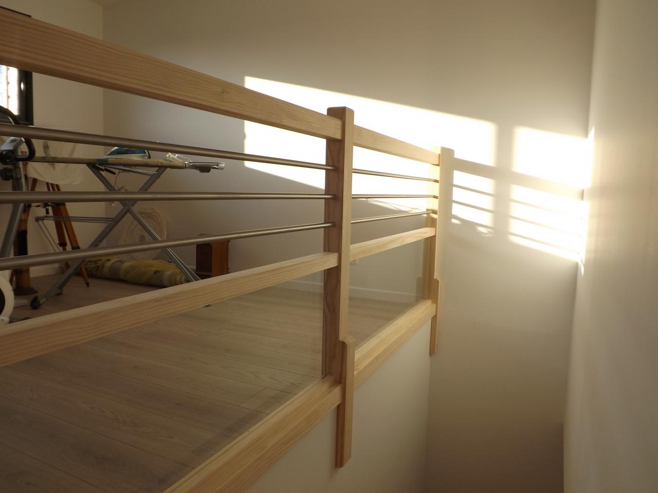 Garde corps en pin avec tube inox sur 3 niveaux et soubassement en verre sécurit
